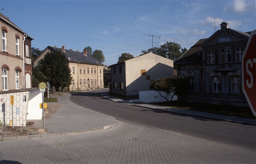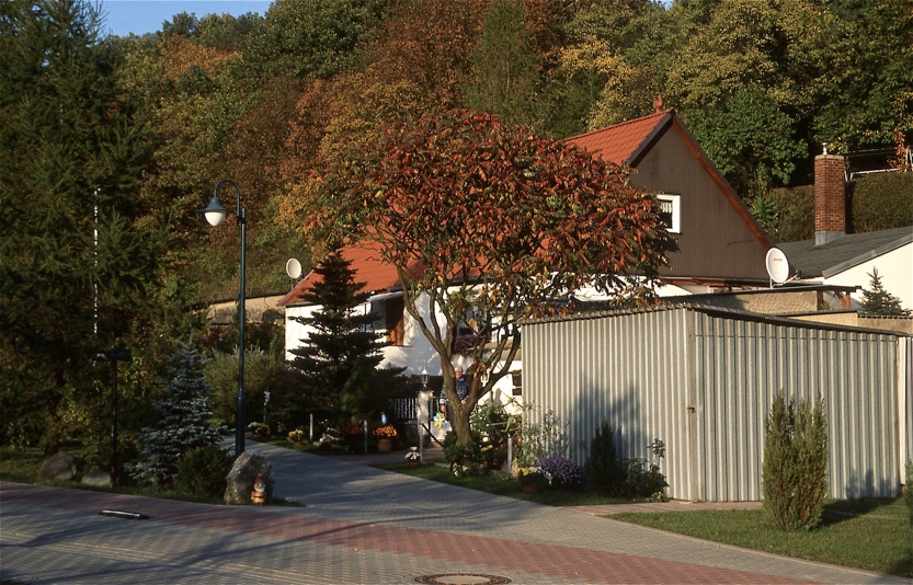 Und wieder eine Szene aus der Triftstraße (16. Oktober); wir blicken auf das Haus Nr. 2, sehr deutlich ist hier der auf der Seite „1997 (Triftstraße)“ erwähnte Abzweig des Sommerweges zu sehen, über den das Haus erreichbar ist. Nichts ist mehr von der Sandwüste zu sehen, auch die Triftstraße ist nun eine moderne Beton-Pflasterstraße.