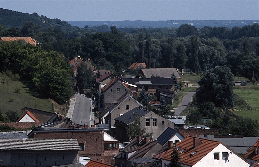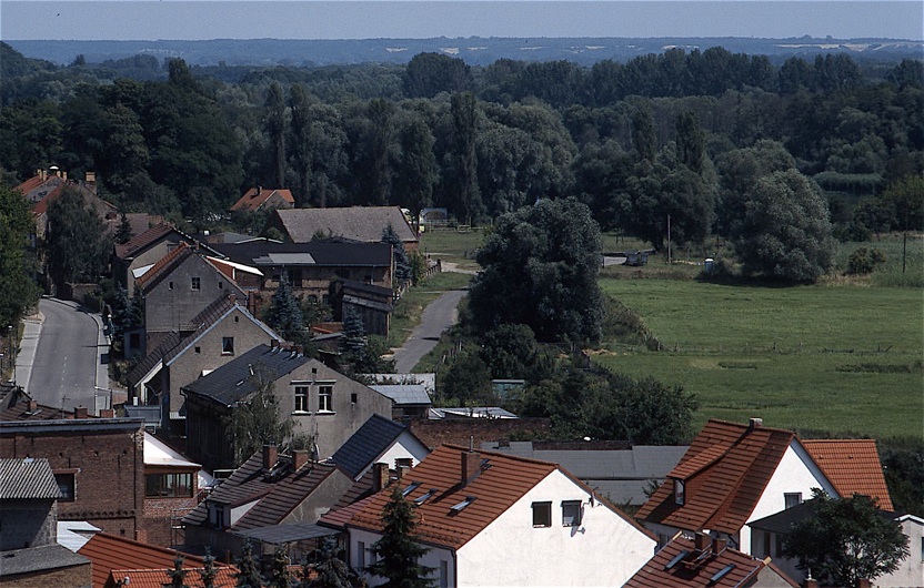 Wahrscheinlich ist es überflüssig, die folgenden beiden Aufnahmen zusammen zu zeigen, eine hätte sicher gereicht. Man sieht lediglich bei der oberen den Ansatz zu Goldbecks Berg, der (wie erwähnt) ganz oben auf seinem Plateau Kurths Berg genannt wird und uns schon mehrfach als geeigneter Aussichtspunkt dienlich war, während dahinter das alte Gutshaus hervor schaut. Auf dem unteren Bild kommen die Wiesen etwas besser zum Vorschein, und auf beiden Fotos erkennt man im Hintergrund den Festplatz sowie sehr gut den Parallelverlauf von Straße und Weg.