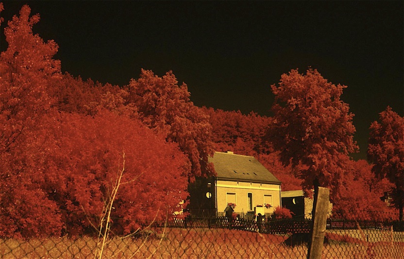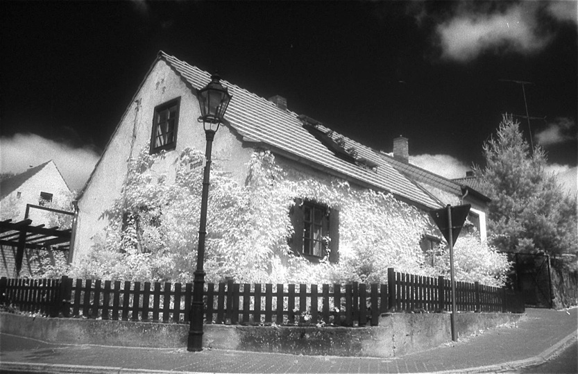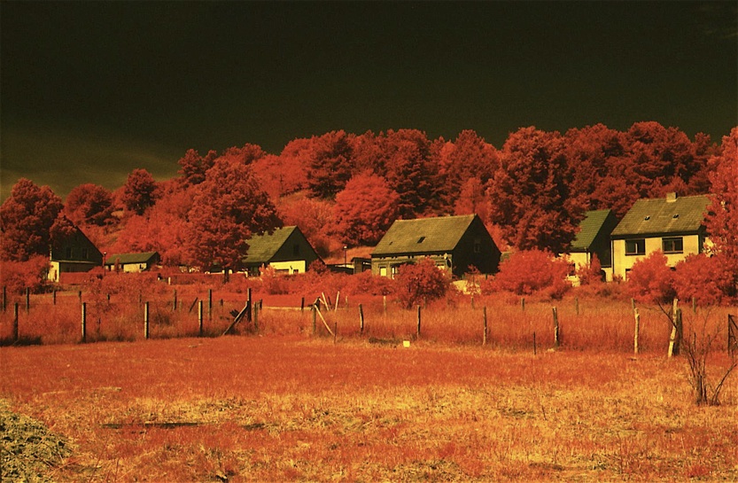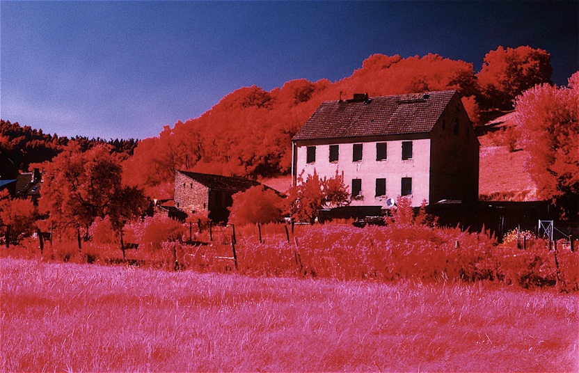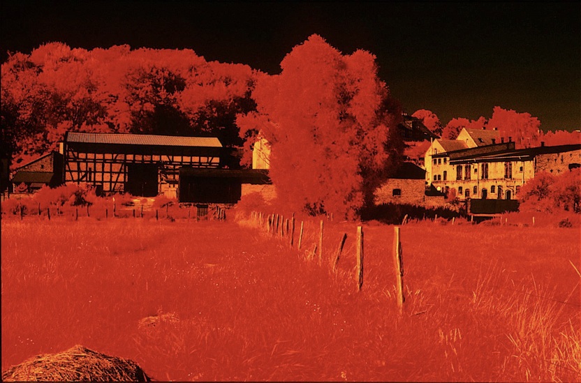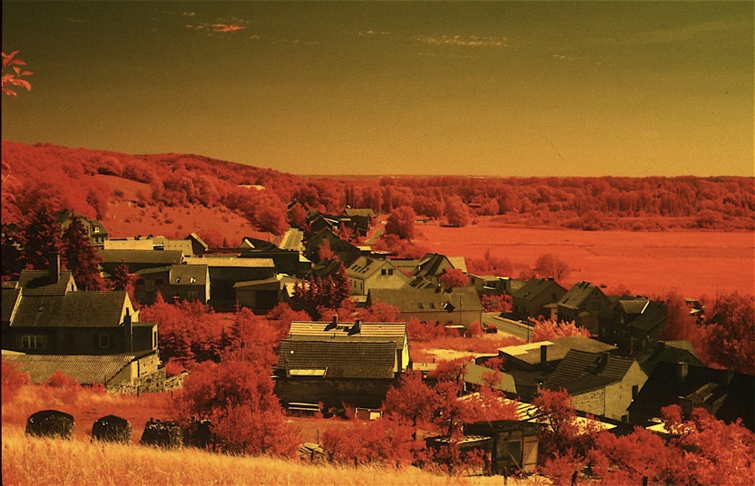 Im Sommer 1998 brachte Kodak einen neuen Farb-Infrarotfilm heraus, der sich nun durch wesentlich kräftigere Farben auszeichnete. Dass die Rottöne der Wiesen und der Bäume hier etwas „vermatschen“, liegt am Scannen, selbst ein hochwertigeres Gerät, wie der Epson V700, stößt hier an seine Grenzen.