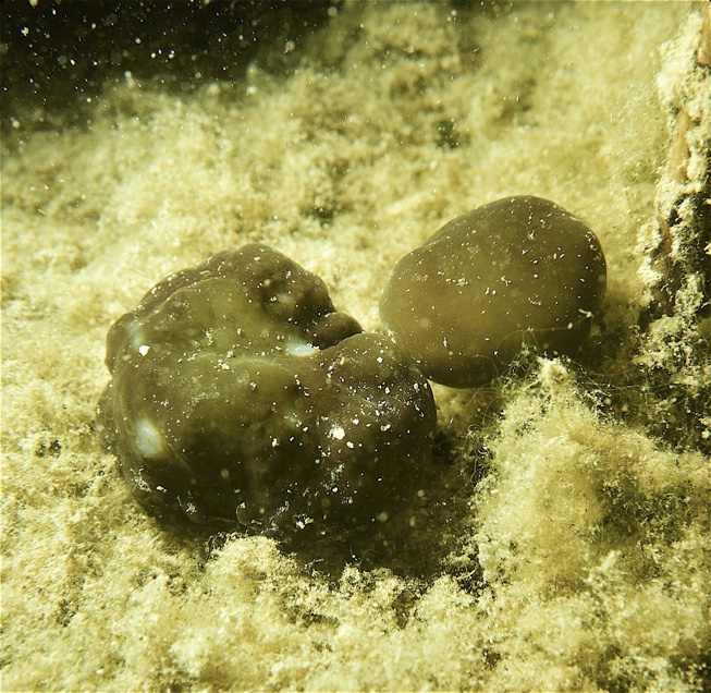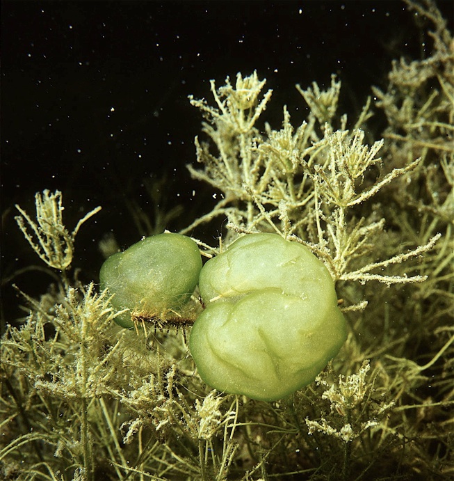 Etwas außer der Reihe sei hier noch die häufig als „Seepflaume“ bezeichnete, koloniebildende Blaualge Nostoc pruniforme gezeigt.