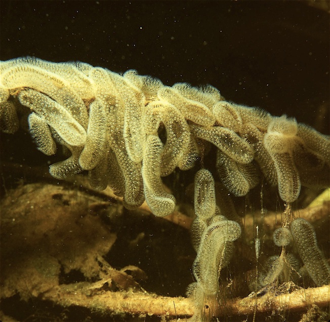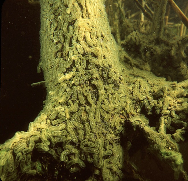 Die wohl am häufigsten anzutreffenden Moostierchenkolonien sind die hier zu sehenden Erscheinungen, die sich aus Cristatella mucedo zusammen setzen und in klaren, stehenden Gewässern - wie hier im Parsteiner See - vorkommen. Sie bestehen aus hunderten bis tausenden flimmernder Einzelpolypen.